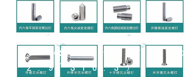 1)十字槽盤頭自鉆自攻螺釘 2)十字槽沉頭自鉆自攻螺釘 3)十字槽半沉頭自鉆自攻螺釘,跟上面沉頭螺絲接近。4)六角法蘭面自鉆自攻螺釘 5)六角凸緣自鉆 自攻螺釘根據材質可分為:鋼材1022A,不銹鐵410,不銹鋼304 1、頭部形狀 頭部形狀各式各樣。有圓頭(半圓頭)、扁圓頭、圓頭凸緣(帶墊)、扁圓頭凸緣(帶墊)、盤頭、盤頭凸緣(帶墊)、沉頭、半沉頭、圓柱頭、球面圓柱頭、喇叭頭、六角頭、六角法蘭頭、六角凸緣(帶墊)頭等。