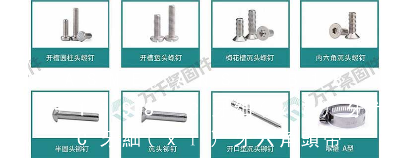 1、頭部形狀頭部形狀各式各樣。有圓頭(半圓頭)、扁圓頭、圓頭凸緣(帶墊)、扁圓頭凸緣(帶墊)、盤頭、盤頭凸緣(帶墊)、沉頭、半沉頭、圓柱頭、球面圓柱頭、喇叭頭、六角頭、六角法蘭頭、六角凸緣(帶墊)頭等。2
