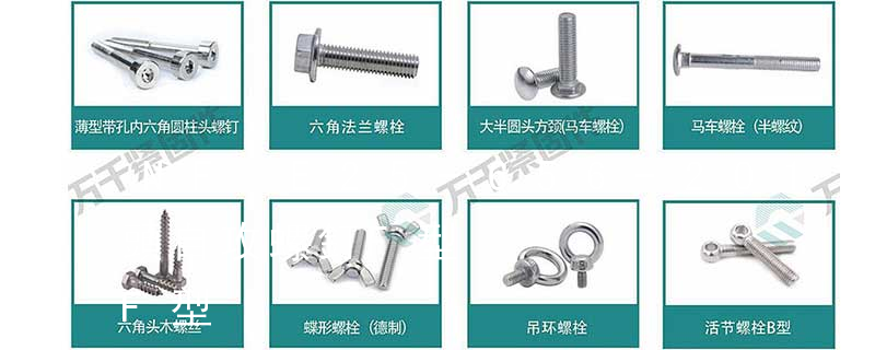 沉頭內六角螺釘(平杯)、半圓頭內六角螺釘(圓杯)、十字槽盤頭機螺釘、十字槽沉頭機螺釘、十字槽大扁頭機螺釘、十字槽盤頭自攻釘、十字槽沉頭自攻釘、十字槽大扁頭自攻釘、全牙絲桿(牙條)、六角螺母、法蘭