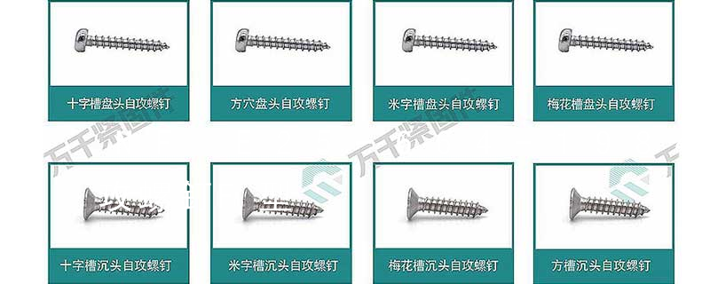 常用的是沉頭自攻螺釘(82°沉頭角),半沉頭(82°沉頭角)盤頭,球面圓柱頭,扁圓頭,半圓頭和六角頭,六角凸緣頭(包括凹穴型)幾種規格。相同公稱直徑的自攻螺釘,自攻螺釘和機螺紋的大徑是不同的,因此孔徑尺寸也不